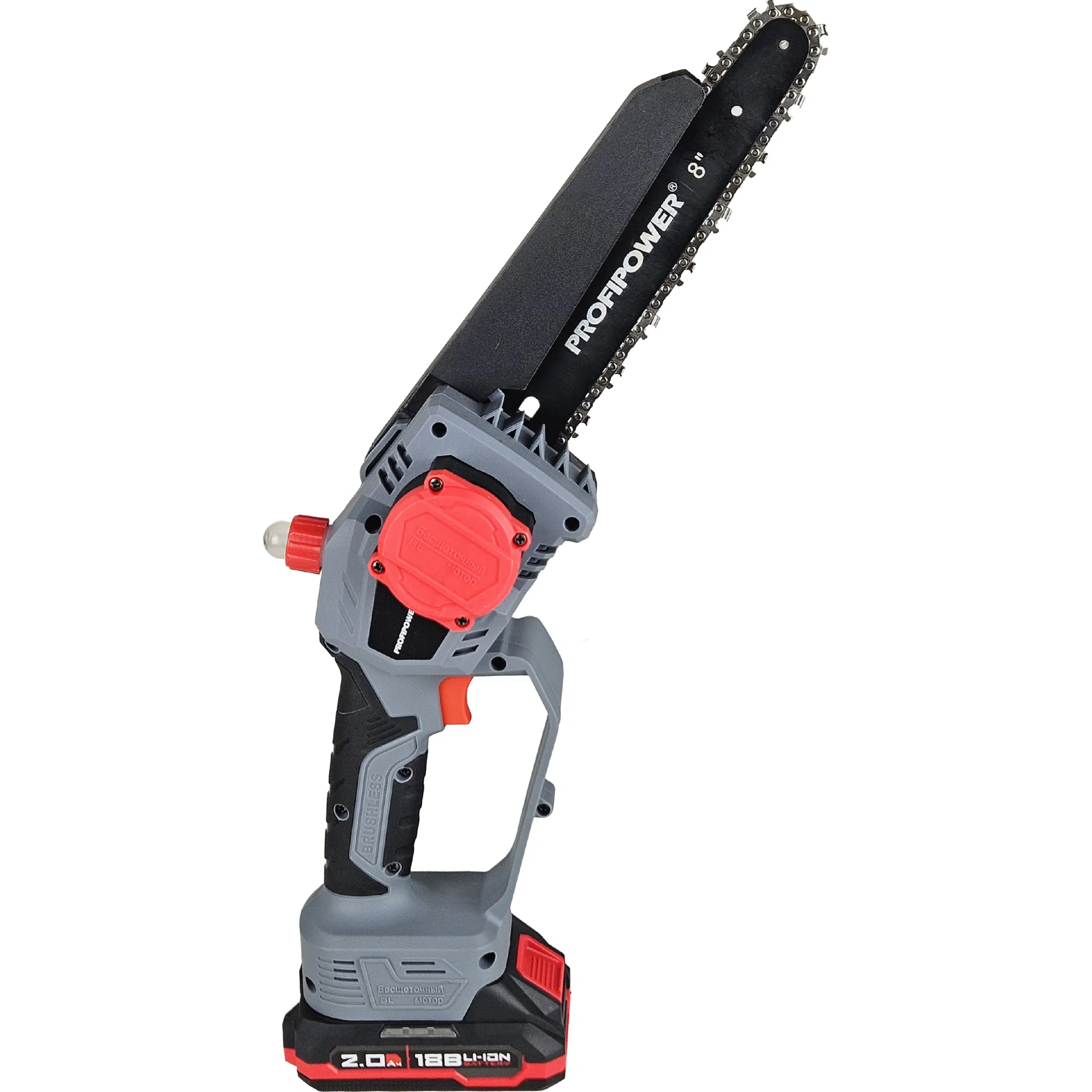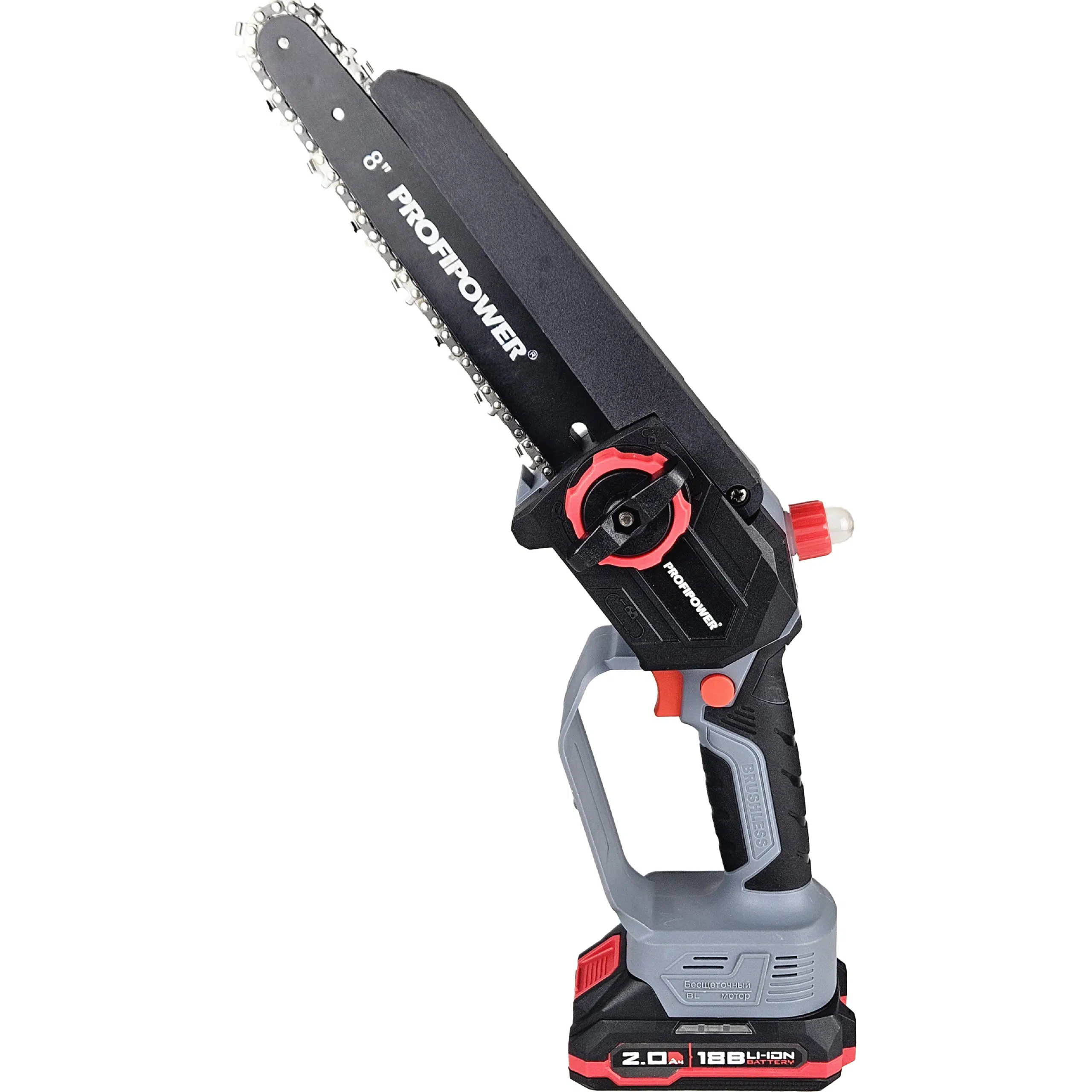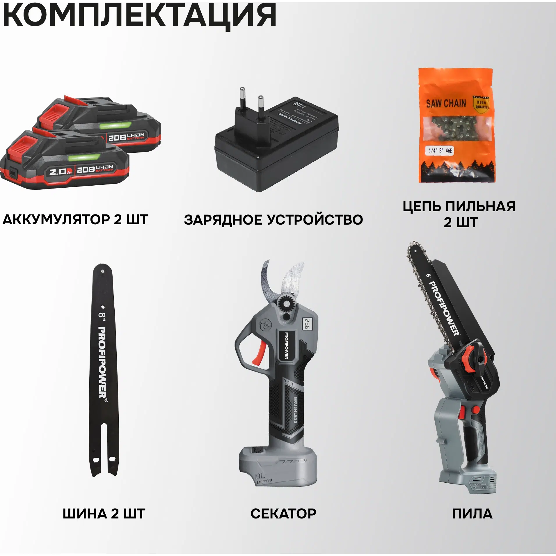 В комплекте: коробка, мини-пила с масляной подачей, секатор, 2 цепи и шины по 8 дюймов