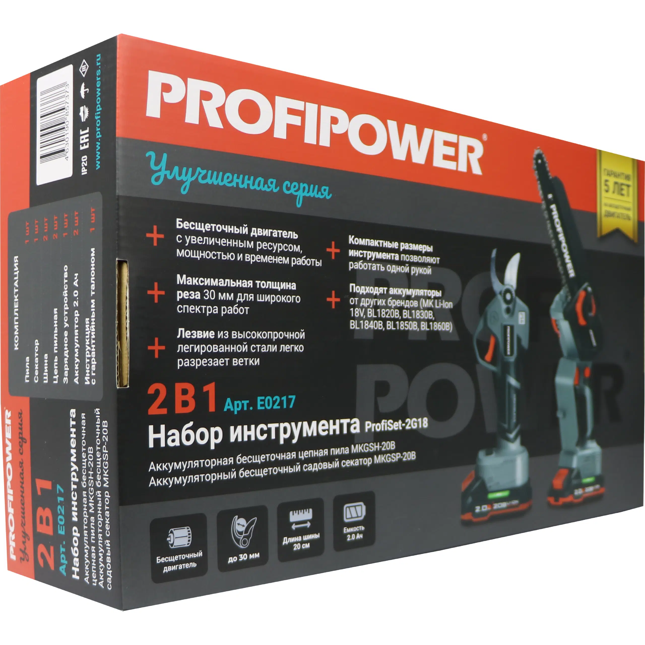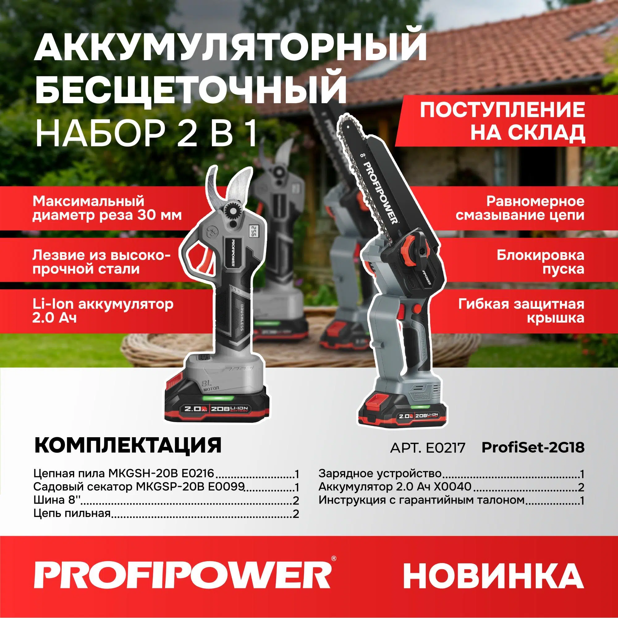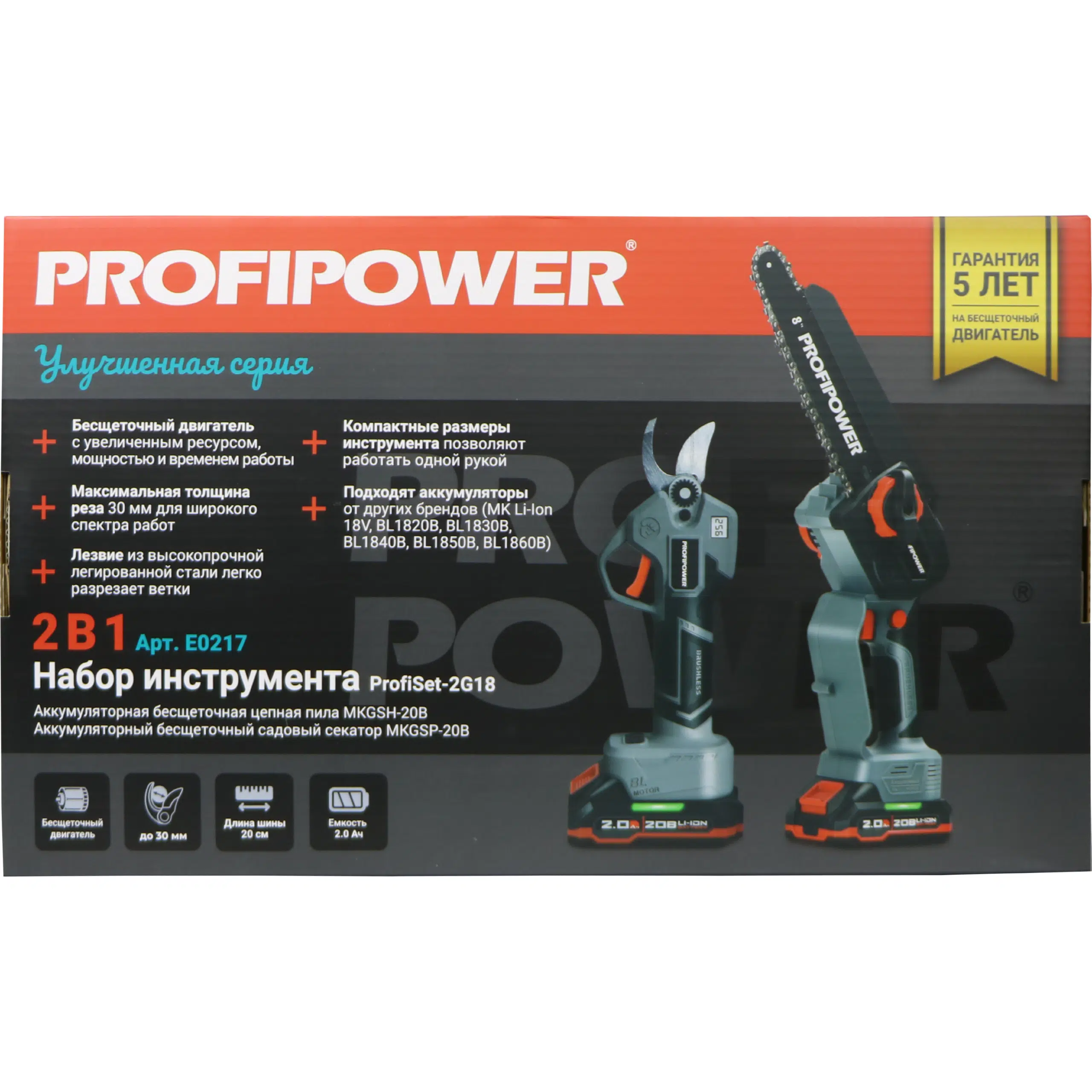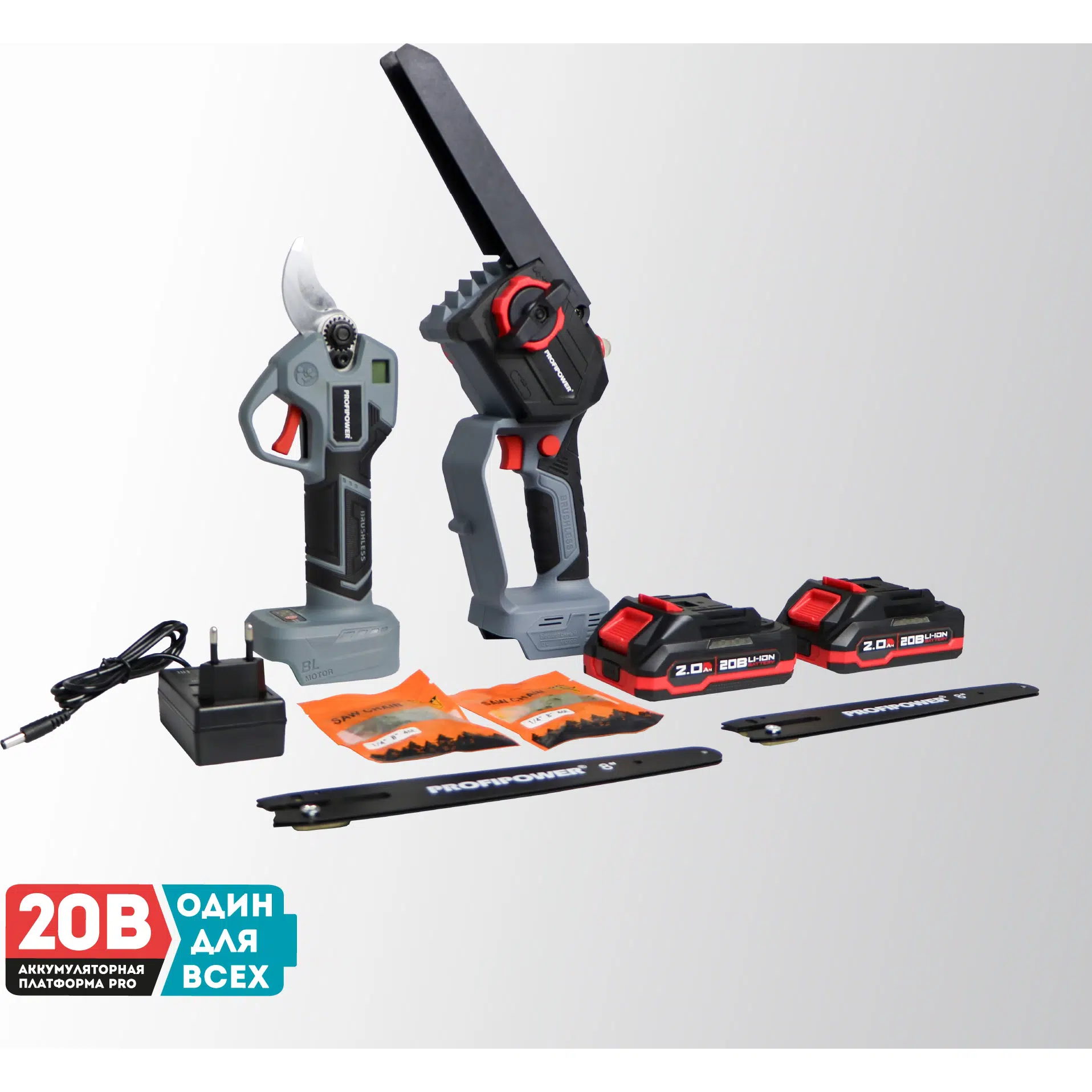 Набор аккумуляторных инструментов PROFIPOWER ProfiSet-2G20 (E0217) — универсальный 2в1 комплект для садовых и бытовых задач. Включает два литий-ионных аккумулятора 20В, 2.0Ач с зарядным устройством и коробку для удобного хранения и транспортировки. В комплект входят мощная мини-пила с масляной подачей, секатор и два комплекта цепей и шин по 8 дюймов — идеально подходят для обрезки деревьев, кустарников и других работ на участке. Бесщеточный двигатель обеспечивает долговечность и высокую производительность. Надежный, компактный и легкий в использовании набор — ваш незаменимый помощник в саду и дома!