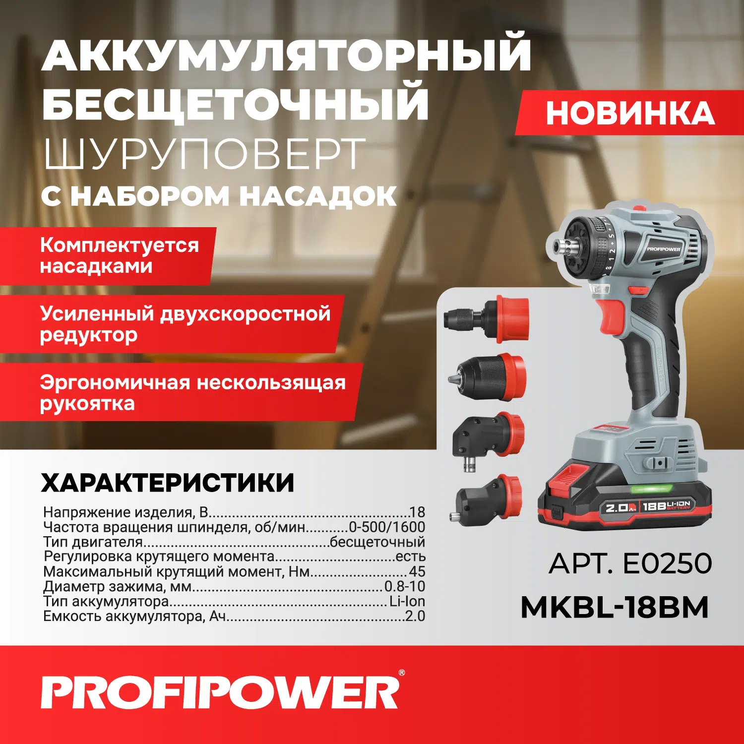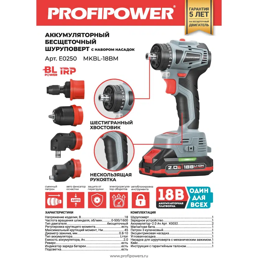 Аккумуляторный бесщеточный шуруповерт со сменными насадками PROFIPOWER MKBL-18BM : идеальный выбор для профессионалов и любителей