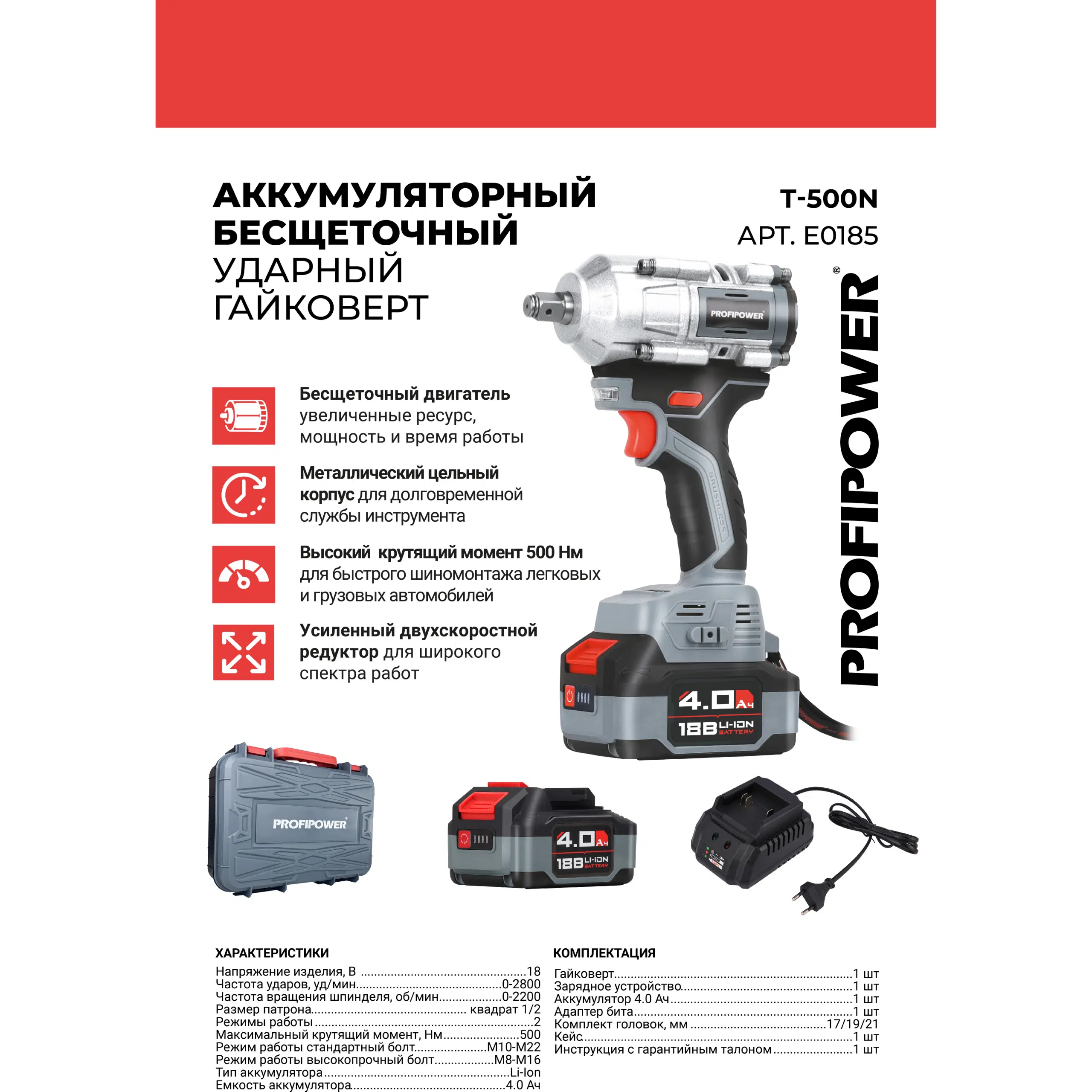 Аккумуляторный гайковерт бесщеточный ударный E0185 ProfiPower T-500N