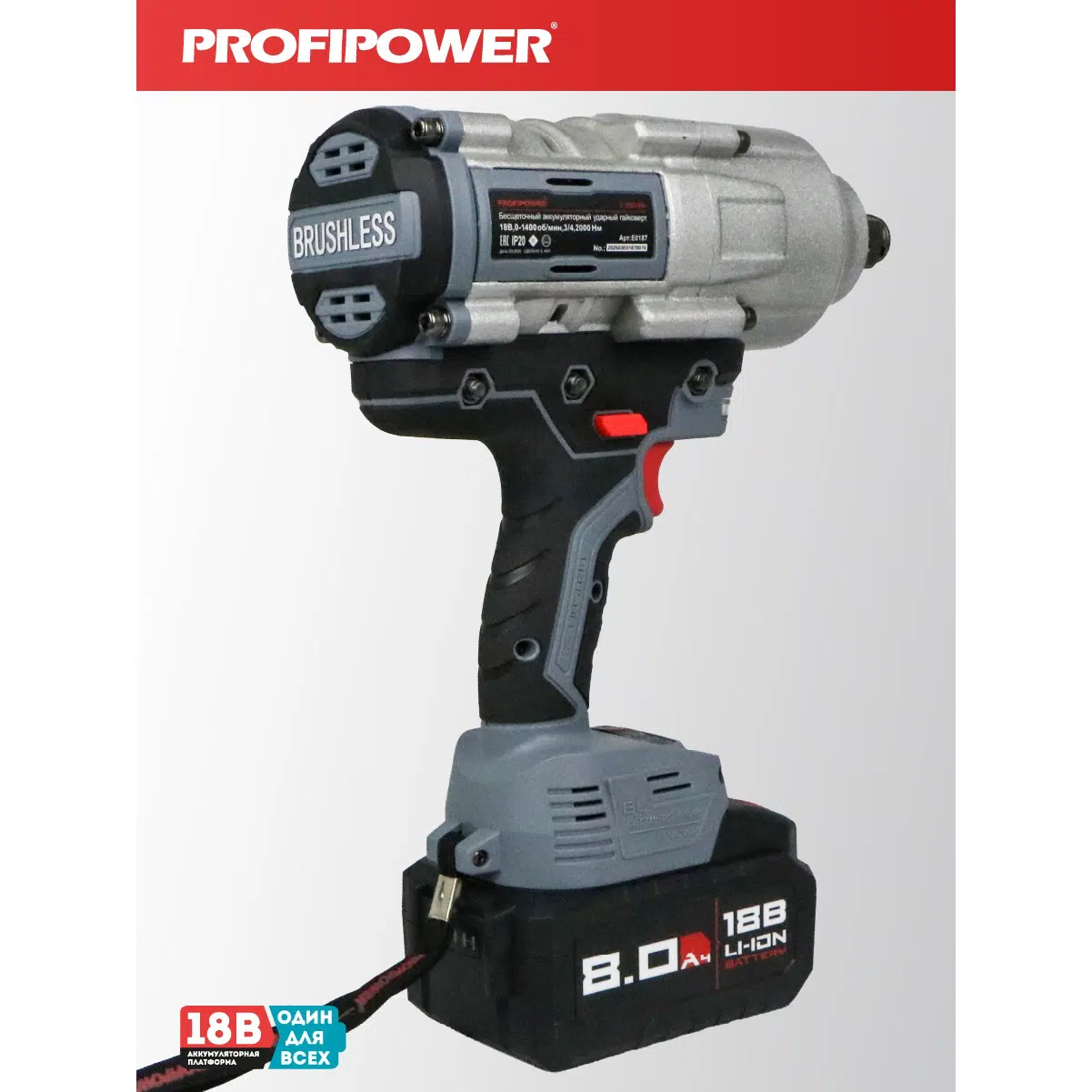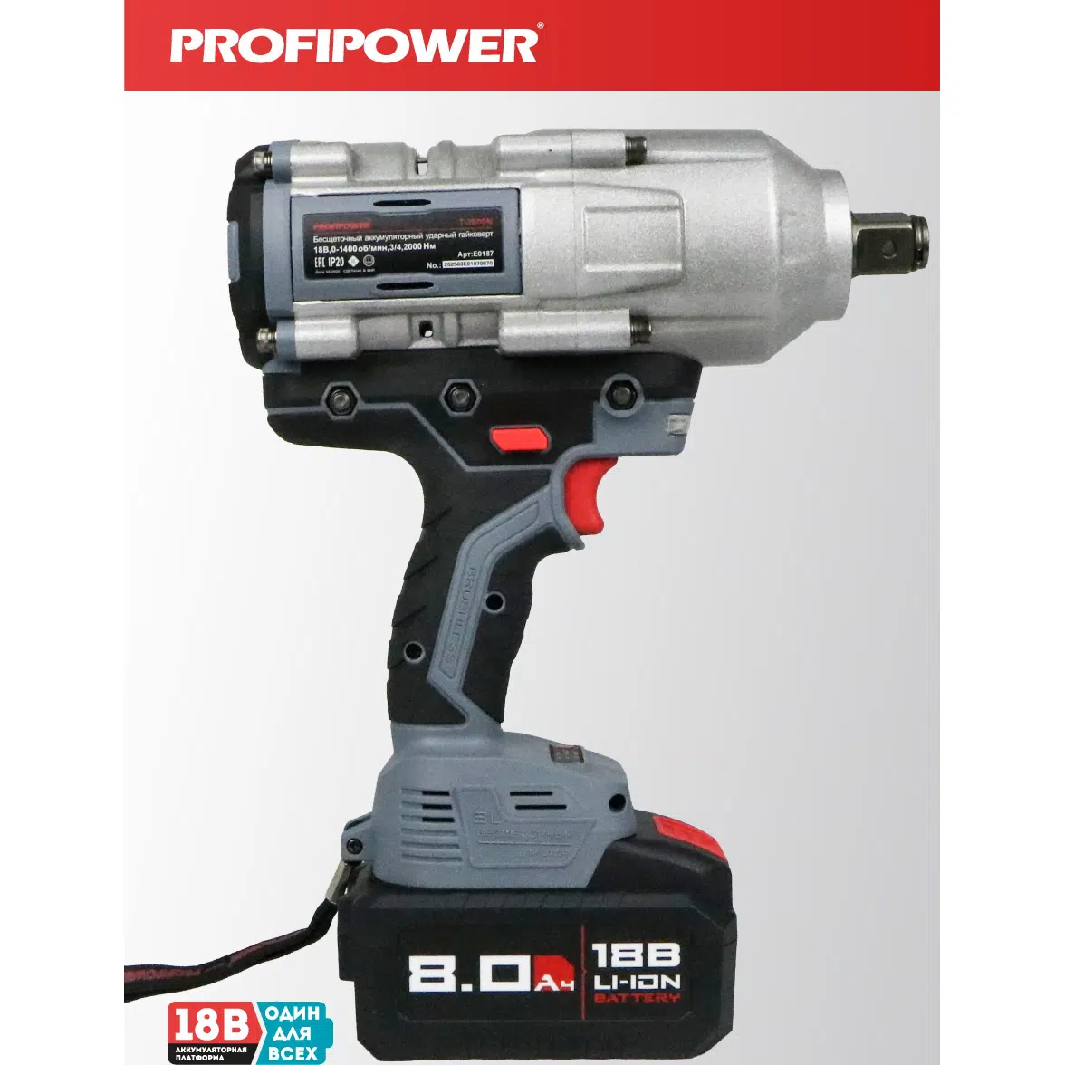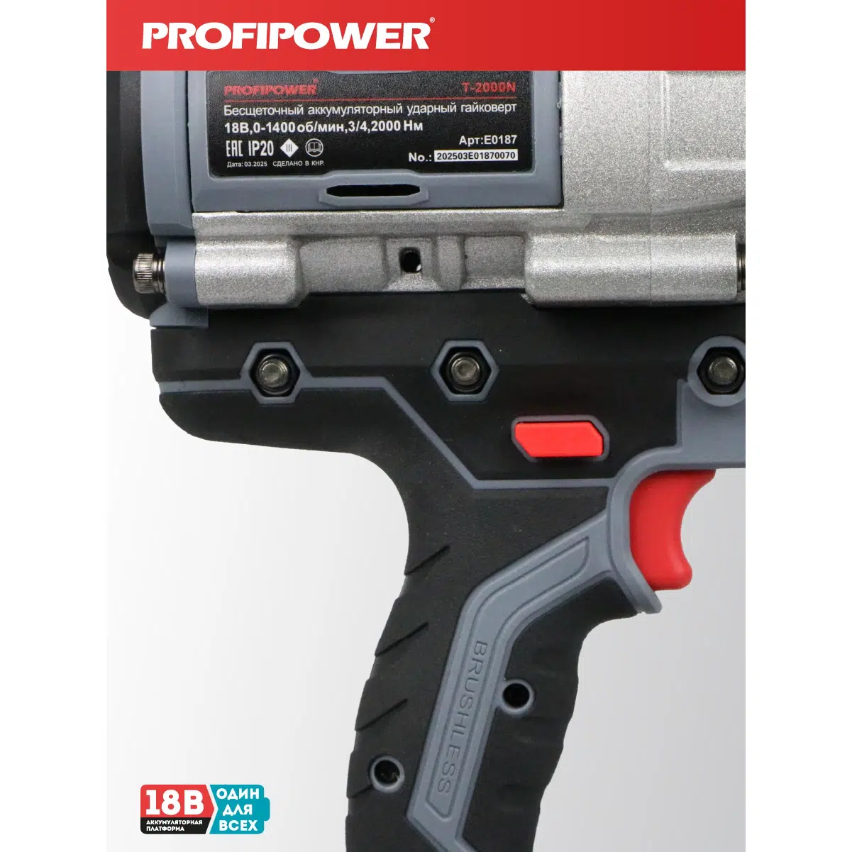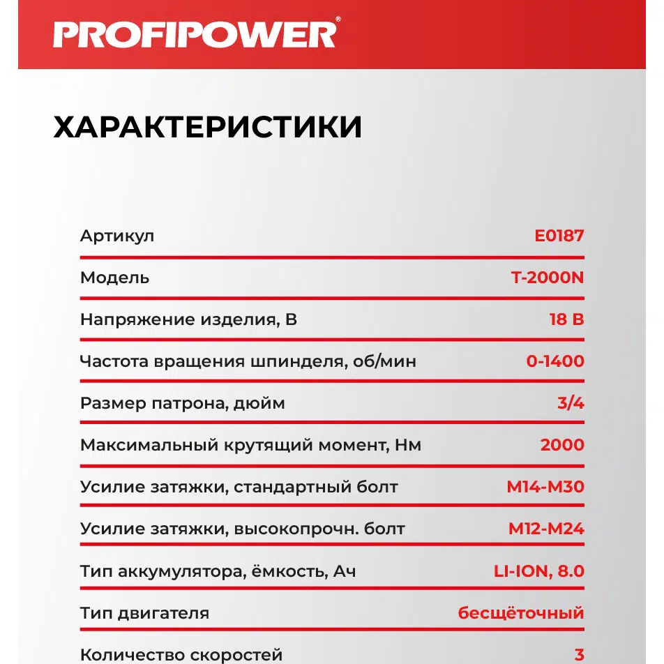 Аккумуляторный гайковерт бесщеточный ударный E0187 PROFIPOWER T-2000N