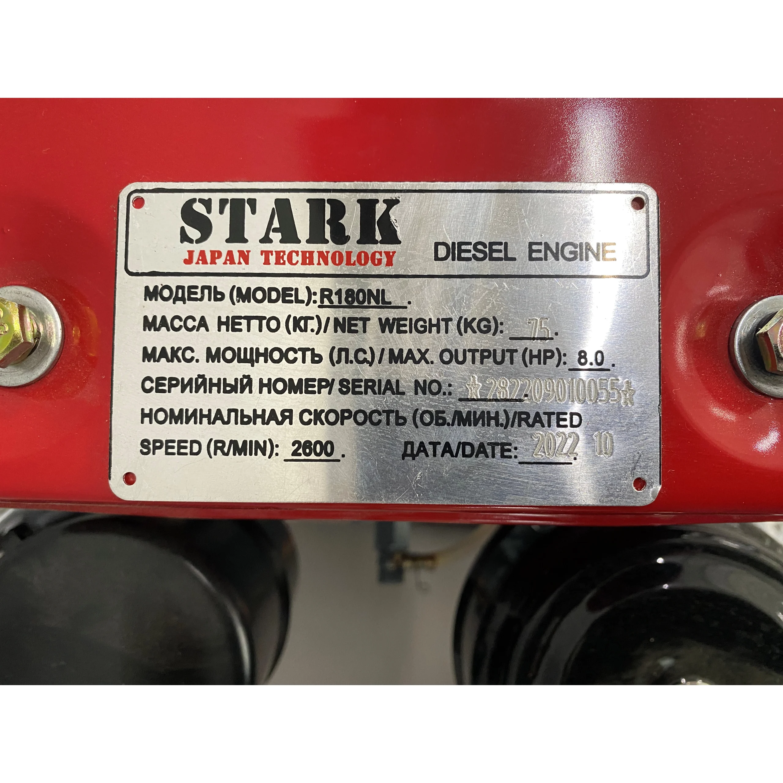 Дизельный двигатель Stark R180NL изготавливается на заводе, который входит в тройку передовых предприятий КНР в сфере дизельных моторов и проходят сертификацию для экспорта в страны Европы. При сходе с конвейера проходит обязательная проверка узлов, агрегатов и двигателя в целом. Буква N в маркировке означает наличие радиатора, буква L наличие фары. Максимальная мощность двигателя может достигать 8 лошадиных сил.