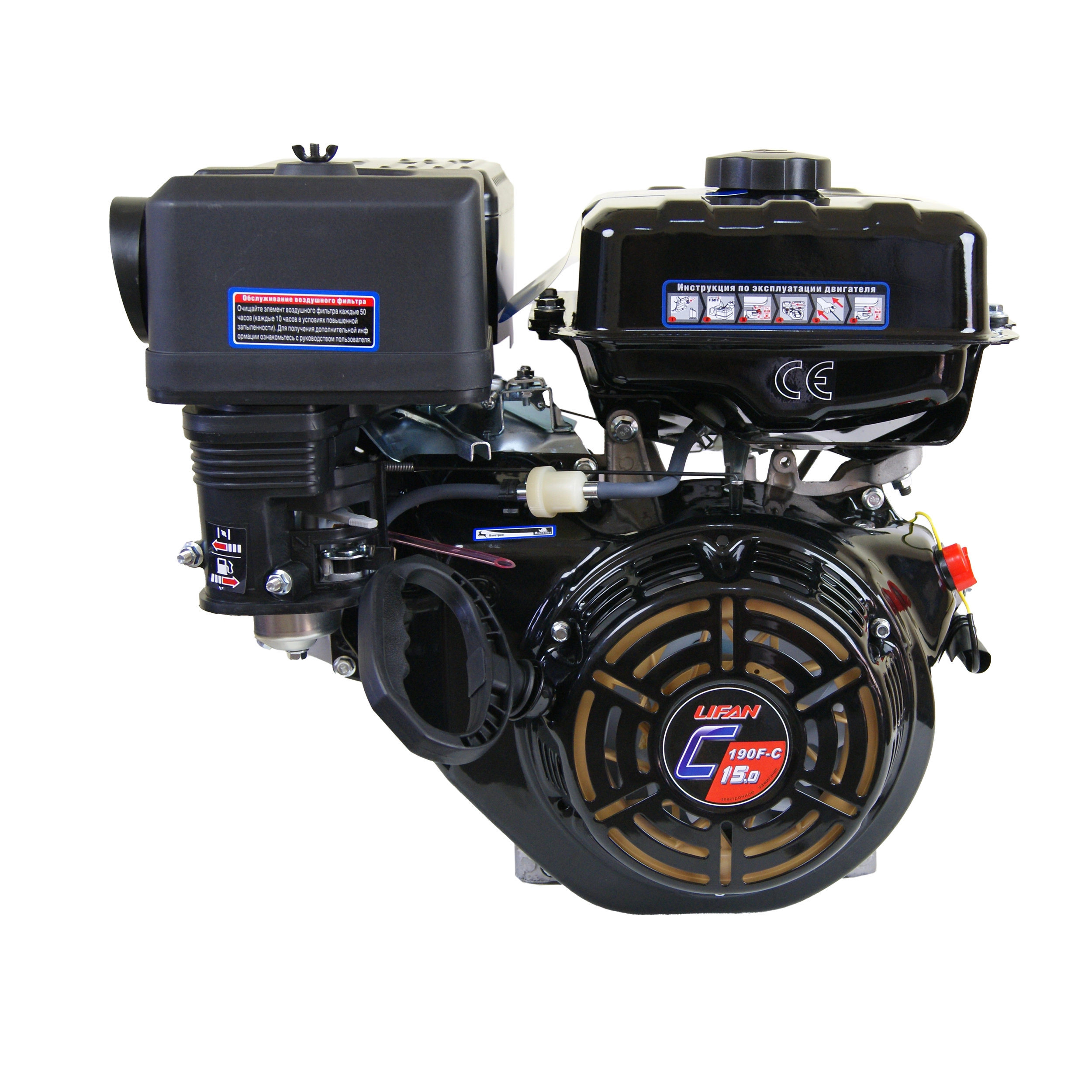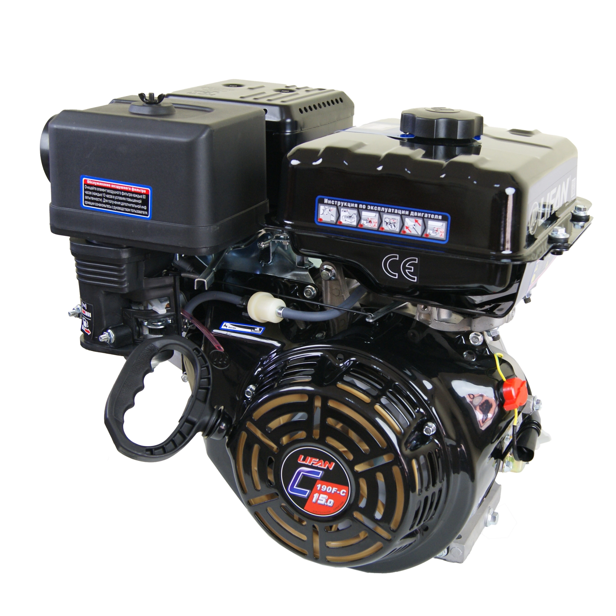 Бензиновый двигатель Lifan 190F-CR PRO — один из двигателей линейки Lifan мощностью 15 л.с. Работает на бензине, что расширяет возможность использования в различных погодных условиях. Двигатель Lifan 190F-CR PRO отличается ребрами жесткости топливного бака, болтами крепления спаечного шва бензобака и дополнительной крепежной площадкой. Оснащается понижающим редуктором с центробежным сцеплением, понижающим обороты 2/1
