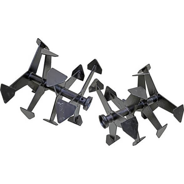 Гусиные лапки тип Агро устанавливаются вместо колес на ступицы мотоблока. Быстро и эффективно рыхлят почву, удаляют сорняки, наматывая их на себя вместе с корнем. Цельносваренная конструкция делает их более прочными. Изготовлены из металла повышенной прочности. Комплектуются сошником-ограничителем (якорь) для удержания мотоблока