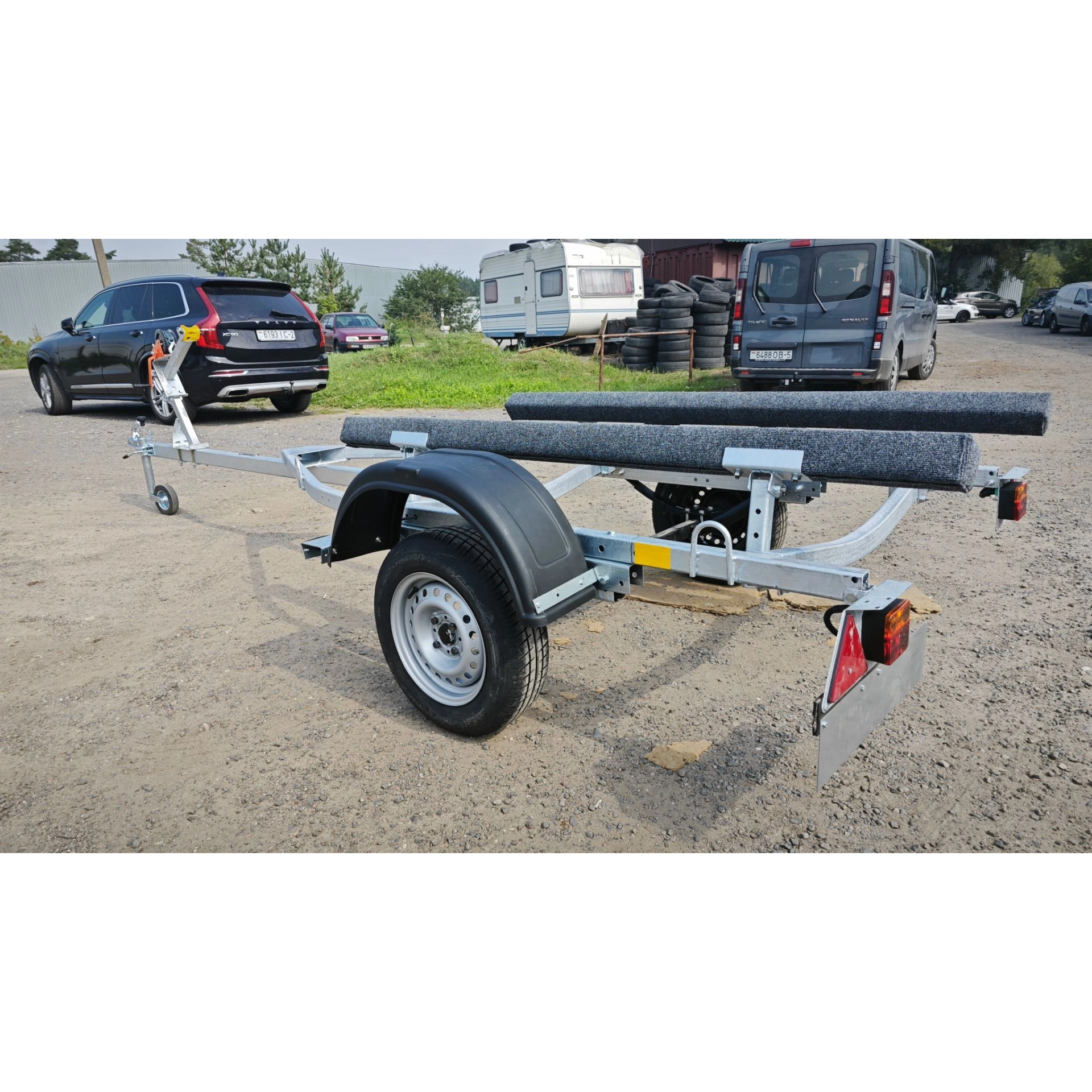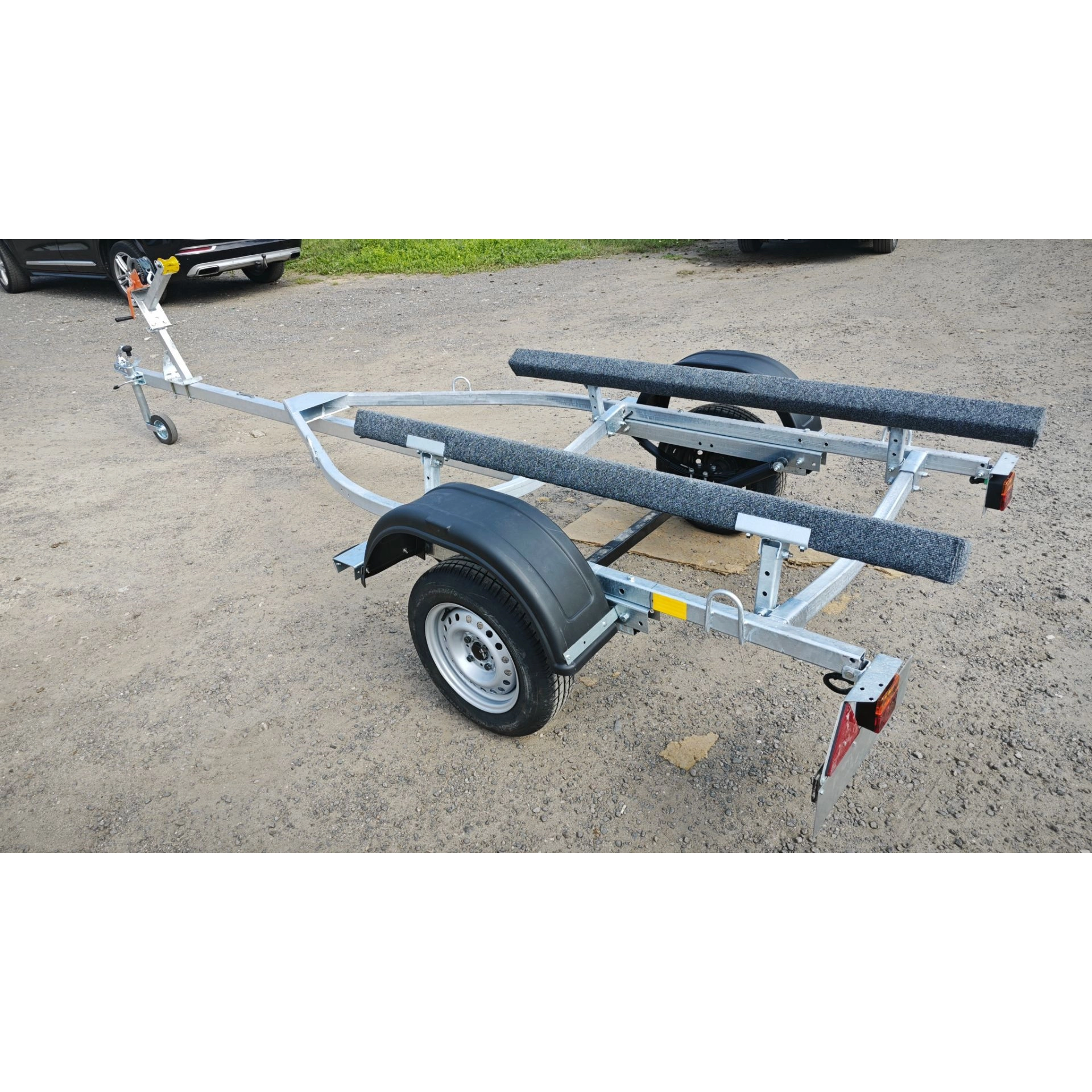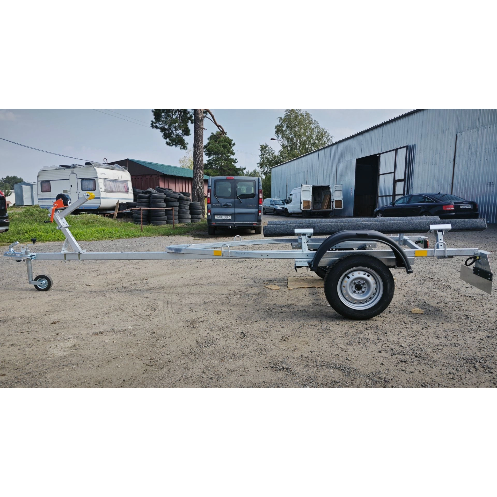 Одноосный прицеп с увеличенной платформой разработан для комфортной транспортировки водной техники. Замкнутый профиль оцинкованной рамы обеспечивает максимальную защиту от коррозии и механических повреждений. Специальная геометрия поперечин позволяет разместить судно с минимальной погрузочной высотой, повышая устойчивость. Рессорная подвеска с амортизаторами гарантирует плавность хода даже на неровных дорогах.