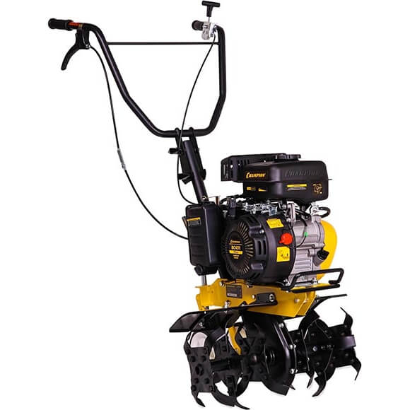 Изделие оснащено 4-хтактным двигателем Champion с верхним расположением клапанов. Обороты двигателя регулируются с панели оператора. Мотокультиватор имеет 1 скорость переднего хода.