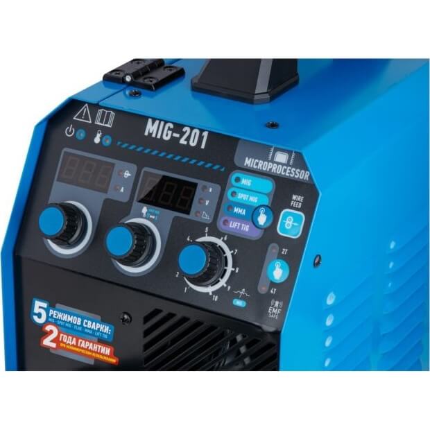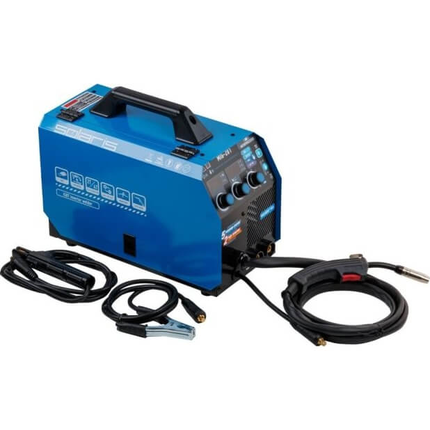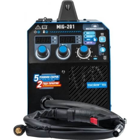 Полуавтомат сварочный Solaris MIG-201 (230В; MIG/SPOT/FLUX/MMA/TIG; встроенная горелка 2 м; смена полярности; 2T/4T; рег.индуктивн.) (MIG-201)