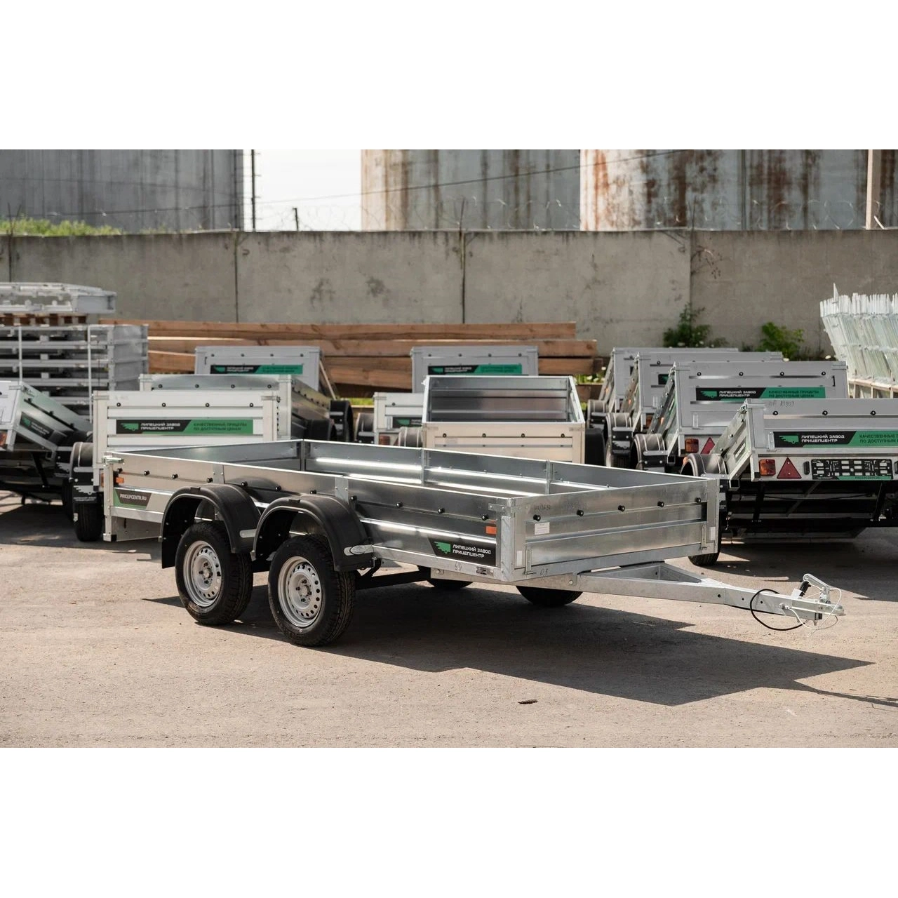 Модель разработана для интенсивной эксплуатации с предельными нагрузками. Полное оцинкованное покрытие обеспечивает максимальную защиту от коррозии, а влагостойкая фанера толщиной 9 мм гарантирует долговечность пола. Двухосная система и четырехлистовые рессоры обеспечивают хорошую устойчивость и плавность хода. Функция самосвала значительно упрощает разгрузку сыпучих материалов.