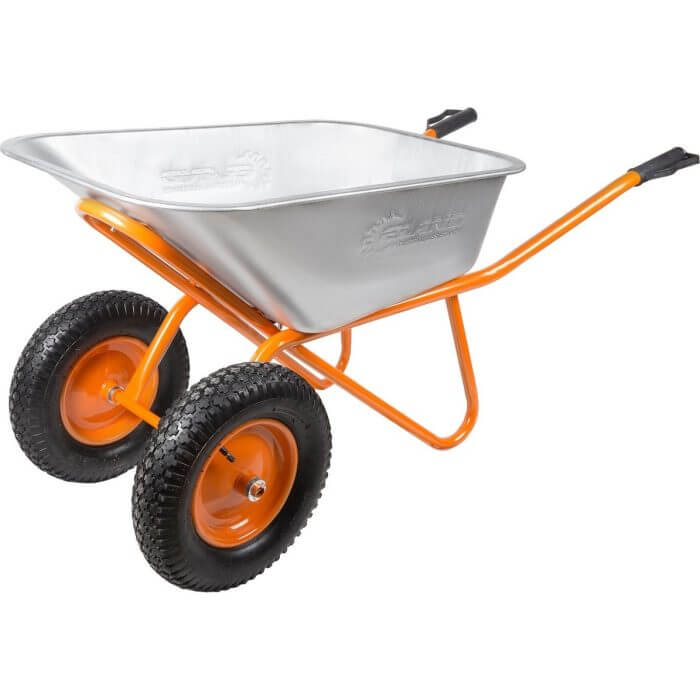Тачка строительная двухколесная. Прочный оцинкованный кузов с усиленной рамой 32 мм. Грузоподъемность увеличена за счет применения 2-х колес. Большие пневматические колеса с пылезащищенными подшипниками.