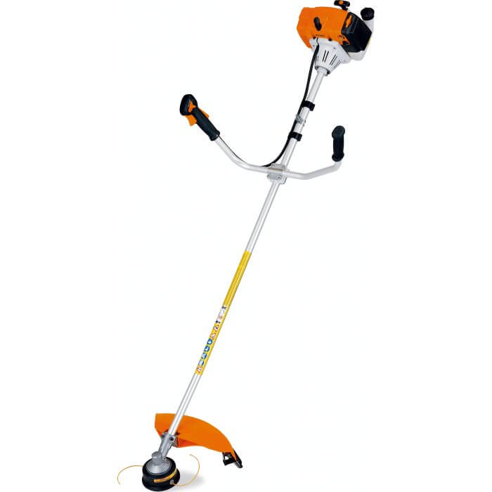 Мощная мотокоса для лесного хозяйства и садоводства. Двуручная рукоятка для удобства скашивания.